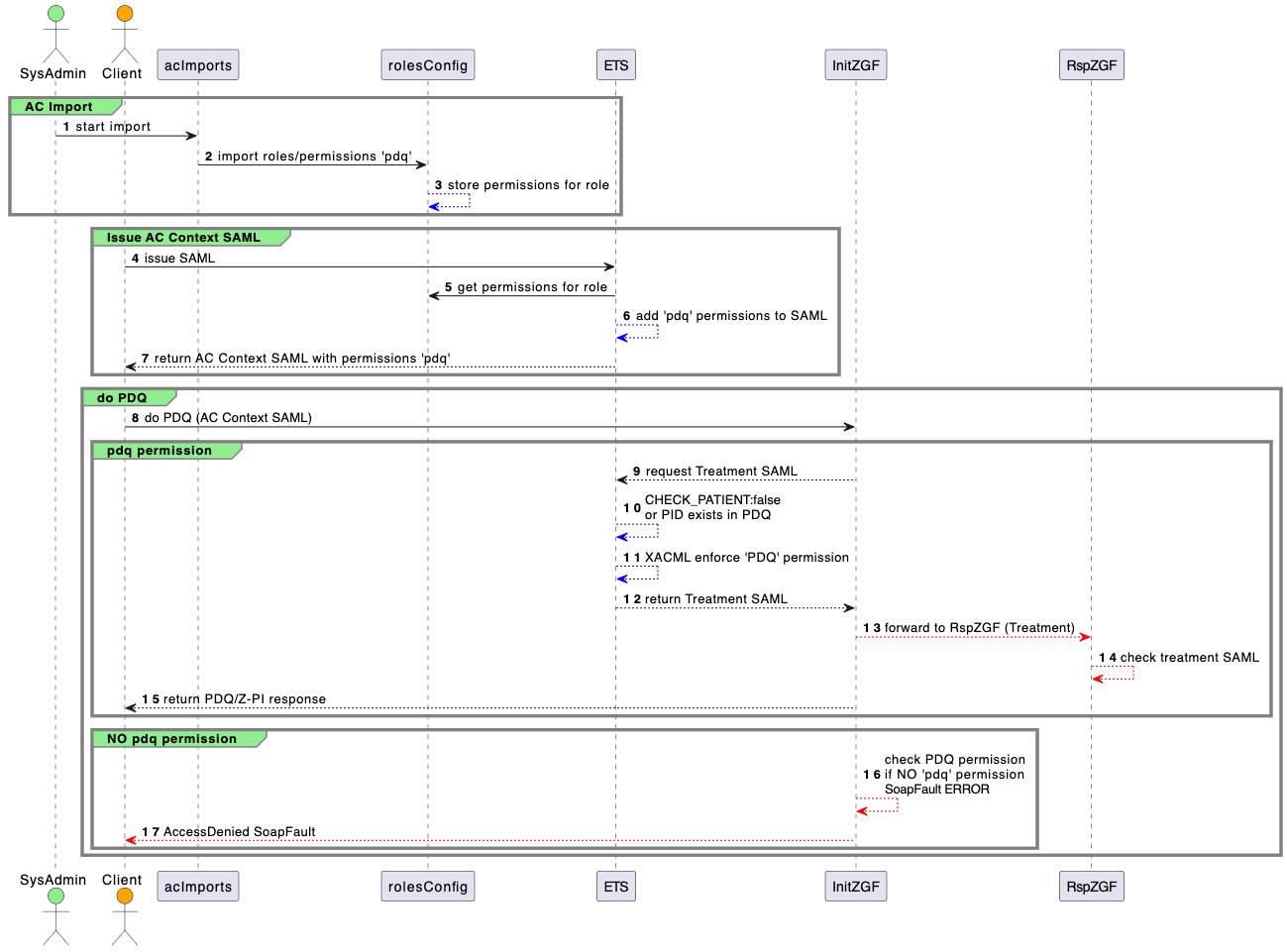 Die AC-Permission für PDQ-Abfragen, die den jeweiligen Rollen zugeordnet werden muss, wird im AC Import definiert. Es kann z.B. eine eigene Permission für PDQ-Abfragen definiert werden (z.B. urn:elga:bes:2019:permission:{{AppId}}:pdq), es kann aber auch wie bei allen anderen Transaktionen jede in der XACML Policy vorhandene Permission (read, write, etc.) verwendet werden. Wichtig ist, dass die verwendete Permission auch in der XACML Policy vorhanden ist. Ist in der AC Kontext-Assertion oder in der XACML Policy keine PDQ Permission enthalten wird eine AccessDenied SOAP Fault zurückgegeben.