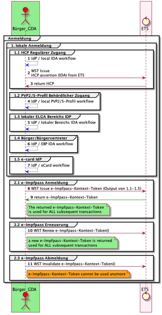 Um sich im Kontext des e-Impfpass anzumelden, muss mit einer ELGA HCP, User I, Mandate I, OBST/eHS-Mandate I, einer lokalen IDA eines vertrauenswürdigen ELGA Bereichs IdPs oder einer PVP2-Assertion (behördlicher Zugang), mittels WS Trust RST, um eine e-Impfpass Kontext-Assertion angefragt werden.